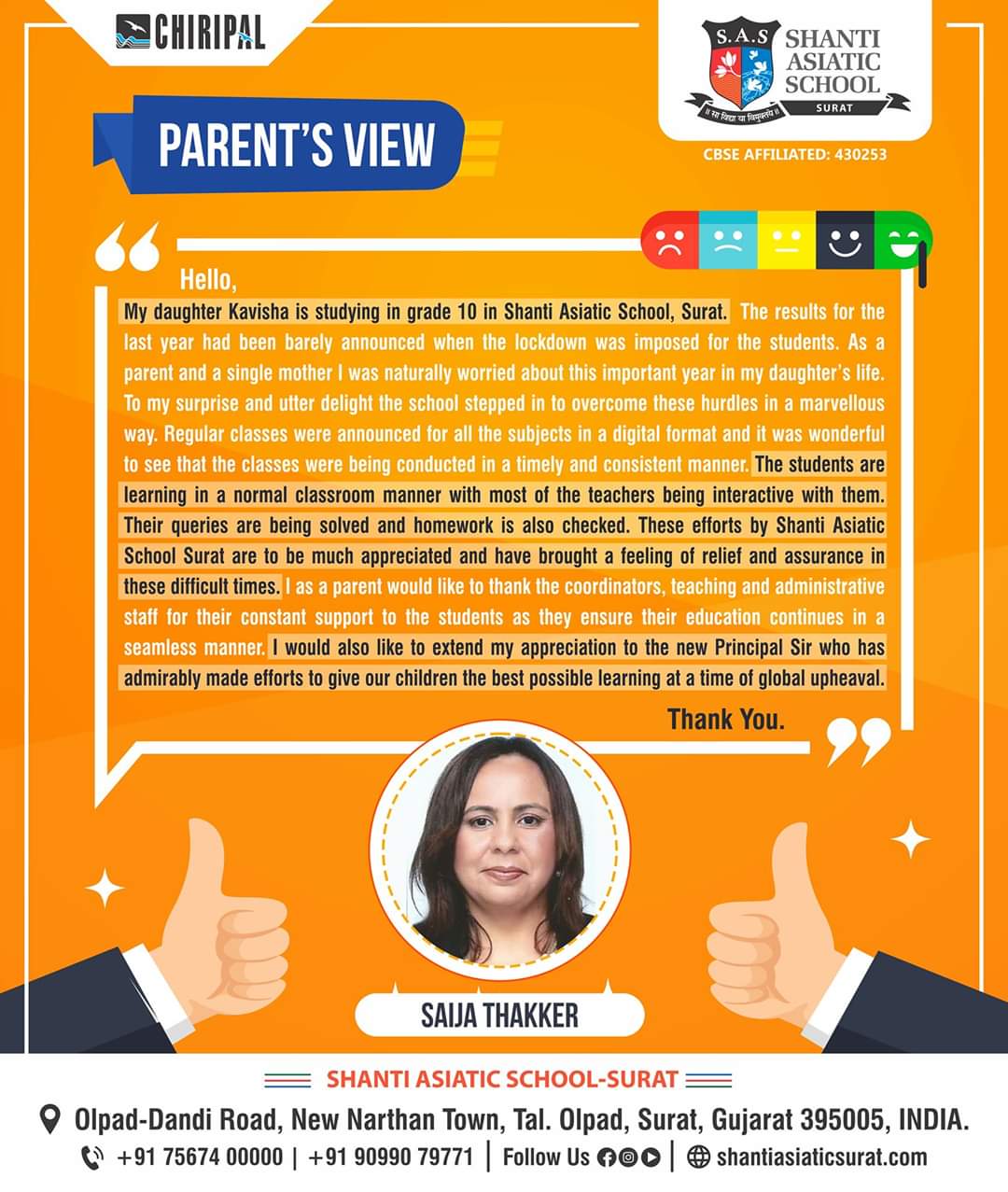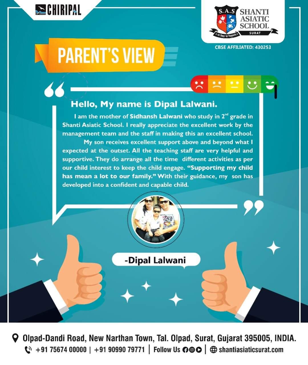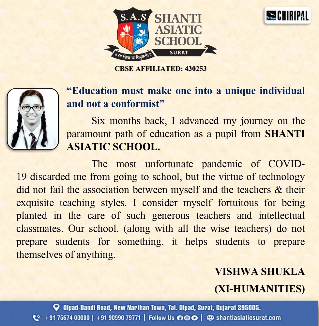 We, at Shanti Asiatic School Surat, believe education should be holistic and progressive that transforms a child to become a successful global citizen of tomorrow. Hence, our approach and outlook is a blend of values with a futuristic vision.